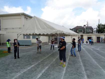 児童が帰った後に保護者の皆様のご協力のもと、児童用のテント設営を行いました。本校でこれだけテントが並んだのは初めてだと思います。明日は児童全員がテントの下、みんなの演技を参観することができます。ご協力下さった皆様、本当にありがとうございました。