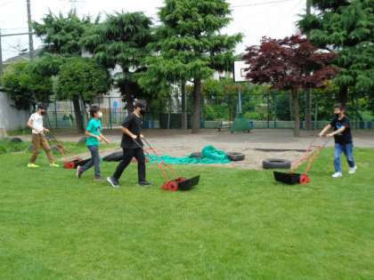 エコ美化委員会では、校庭の芝刈りをしました。芝刈り機を使って楽しく活動をしました。芝刈りを終えると青々と茂ってきた芝がよりきれいに見えます。