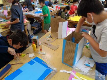 図工は「ダンボール工作」です。想像して考えたものを目指して、ダンボールを切って組み立てていきます。基本は箱ですが、個性豊かな作品が出来上がっていました。