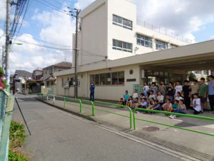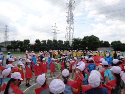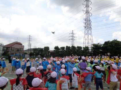 中休みは全校で校庭に出て、航空写真を撮りました。割り当てられた場所に、違う色のエプロンを来てのぞみました。航空写真はドローンを使って撮りました。ドローンが軽快に飛ぶので、子供たちは歓声を上げていました。航空写真を撮るときは丁度、太陽が雲に隠れていてよかったです。楽しく撮影することができました。