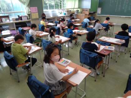 生活科は1学期にお世話になった「小1サポーター」の皆さんに、お礼のお手紙を書きました。「一緒に下校したこと」「配膳のお手伝いに来てくれたこと」「着替えのお手伝いをしてくれたこと」など、よく思い出して書いていました。このお手紙は9月に入って渡す予定です。