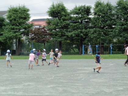 今日は途中から雨が止んだので、1組は校庭に出て遊びました。担任の先生と一緒に遊ぶおにごっこはみんな大好きです。