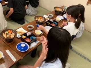 友達との入浴です。温泉最高!の声が聞こえてきました。18時からおいしい夕食をいただきました。豪華なお食事です。私の近くの5人くらいの子は、ご飯のおかわりを5杯していました。