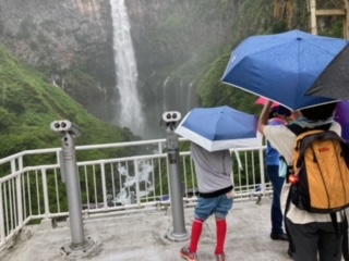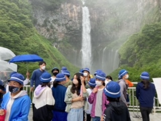 華厳の滝を見学しました。雨です。結構降ってきました。滝を下から見るためにエレベータに乗りました。音も凄く、とても迫力のある滝でした。滝の下の方は夏とは思えない冬のような寒さでした。