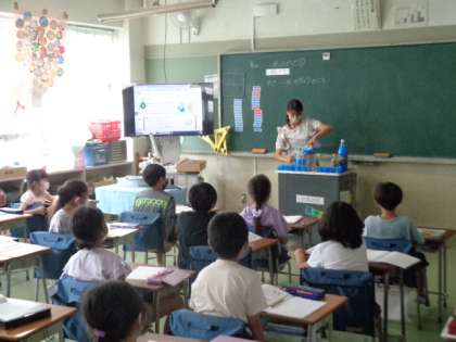 2年生の算数は「水のかさ」の学習からスタートです。先生がいろいろな大きさの容器を用意してくれました。わかりやすいように水に色をつけて、かさくらべです。どちらが大きいのかな?どうやってくらべればいいのかな?みんなと相談しながら進めていました。