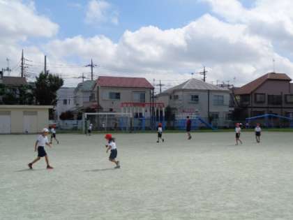 校庭で体育も行われました。1組は鉄棒です。先生がこつを丁寧に教えてくれます。2組はいろいろな鬼遊びをしました。みんなと取り組むのは楽しいですが、暑いので休みを入れながら取り組んでいました。