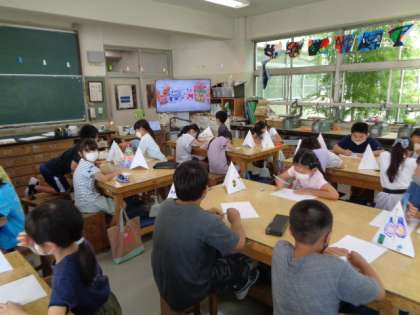今日は最初の授業なので、シーサーの絵を描いてみました。先生が沖縄のいろいろなシーサーの写真を大型画面に紹介してくれます。でも、みんなにとってシーサーの絵を描くのは難しいようです。悩みながらもがんばって描いていました。この後、粘土を使って実際にシーサーを作ります。どんなシーサーが出来上がるのか、楽しみです。