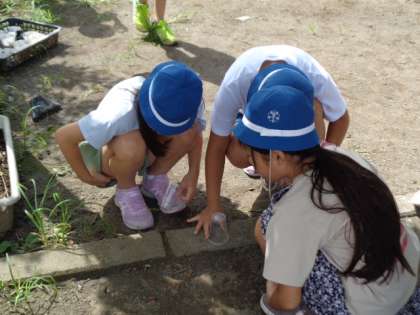 理科は「ヒマワリ」「ホウセンカ」を観察しつつ、教材園にいるこん虫を探しました。今日は湿っているので、お目当ての虫はなかなか見つからないようです。トンボは飛んでいるけど、捕まえられないからあきらめていました。