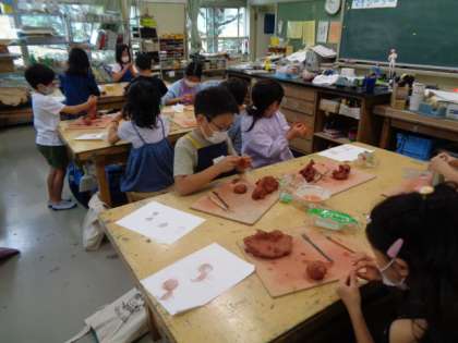 図工は「マイシーサー」づくりの続きです。今日は実際に粘土でシーサーを作りました。一人一人のシーサーの顔が違っておもしろいです。へらを使って丁寧に作っていました。