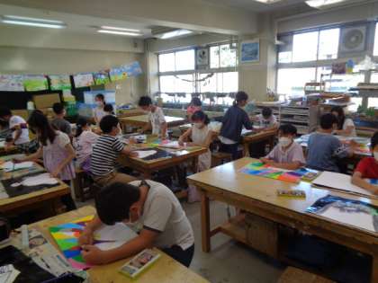 図工は「へんてこ山の物語」の作品作りの続きです。今日は山の背景をクレヨンで色をぬり、色をぬったところに黒のアクリル絵の具をぬり重ねました。アクリル絵の具がかわいた後、黒い部分をスクラッチすると下の色鮮やかなクレヨンの色が出てきます。この後、山の中の色を塗り、スクラッチをして完成です。
