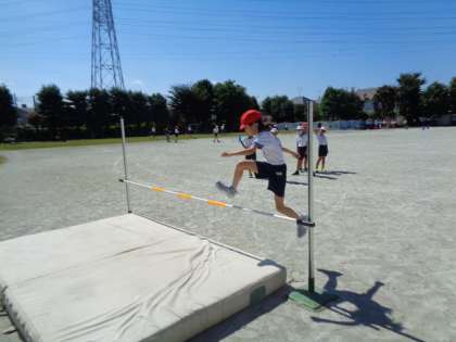 体育は「走り高跳び」です。今日は短距離走のタイムを測りました。記録をもとに高跳びのバーのおよその高さを予想します。3グループに分かれ、練習をくり返していました。