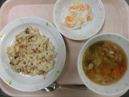 山菜ピラフ・大豆の田舎風スープ・フルーツヨーグルト