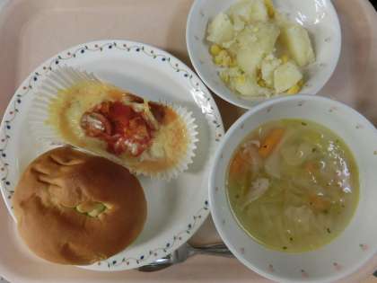あしたばパン・白身魚のピザ風・コーンポテト・ベーコンと野菜のスープ