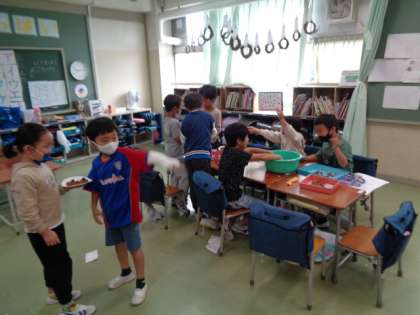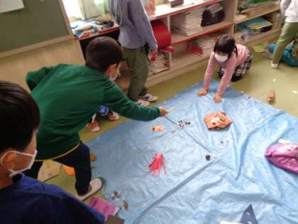 各クラスでは、「秋まつりの準備」が進んでいます。持ち寄ったどんぐりを使って、いろいろなお店を考えています。来週の26日(水)に翼保育園の園児の皆さんをお呼びして、いっしょに遊ぶ予定です。とてもはりきって意欲的に取り組んでいます。