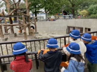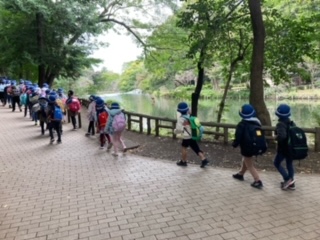 1年生は井之頭自然文化園へ遠足に出かけました。少し肌寒いです。雨は降っていません。今日の目的は、自然やいきものに親しむこと。友達と仲良く活動すること。交通ルールや園内のマナーを守ることです。