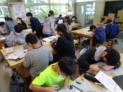 図工は「メタリックアート」を作製中です。ダンボールの上にボール紙で型を切り取って順に貼っていきます。とても細かい作業にもチャレンジしている子も。集中して取り組んでいる様子は、さすが6年生です。
