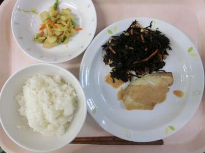 ごはん・魚のゴマダレかけ・ひじきの煮つけ・白菜のお浸し