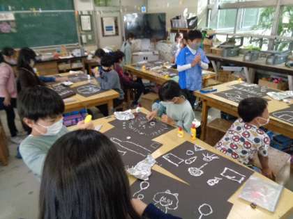 図工は「キラキラワールド」を作製中です。今日はアルミホイルの線で絵を描きました。かわいい絵が並んでいます。この後、線の中の色を塗っていきます。