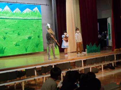 学芸会がいよいよ来週に迫りました。今日は本番のように体育館を暗転してから、演技を流してみました。演技も歌もとてもがんばっています。