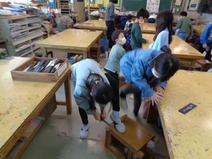図工は「切ってつないで」という作品づくりに挑戦中です。今日は角材をのこぎりで切りました。角材を切るときは「角材をおさえる人」「角材を切る人」と役割分担をして友達と協力して切ります。先生の指示をよく聞いて、丁寧に進めていました。小さく上手に切っています。