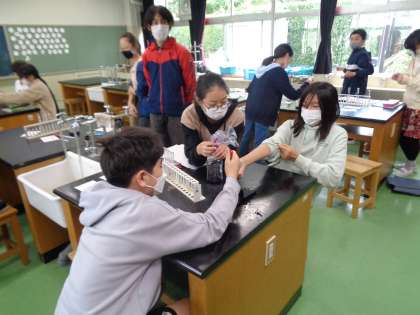 理科は「水溶液の性質」という学習で、アルカリ性や酸性、中性などを学習します。水溶液の性質を調べるときに、リトマス紙というものを使いますが、今日はムラサキキャベツを使った指示薬を作って調べてみました。指示薬が少し濃かったようですが、きちんと反応が出たようです。自分たちで作って調べるので、子供たちはとても楽しそうに取り組んでいました。