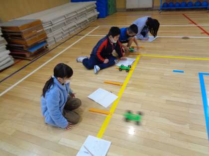 理科は「ゴムのはたらき」という学習をしています。ゴムの力を利用して走らせる車で、ゴムのはたらきを調べます。ゴムをたくさん伸ばしたら、ゴムの本数を代えたら、どうなるでしょう。車の走った距離を記録しながら、ゴムの性質をしっかり調べていました。とても楽しそうです。