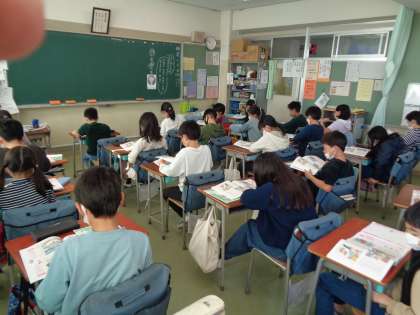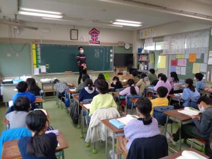 国語は「プラタナスの木」という物語文の学習をしています。先生が言葉に着目しながら、場面ごとの様子をみんなと一緒に考えながら、進めていました。