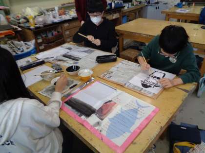 図工は「墨で表す」という題目で、墨の絵を描いてみました。墨汁の濃淡や筆の線の太さなど、同じように表現するのは難しいです。練習をくり返しながら、よりよい表現を探っていました。