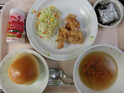 ロールパン・とり肉の唐揚げ・コールスローサラダ・コンソメスープ・ブラウニー・ジョア