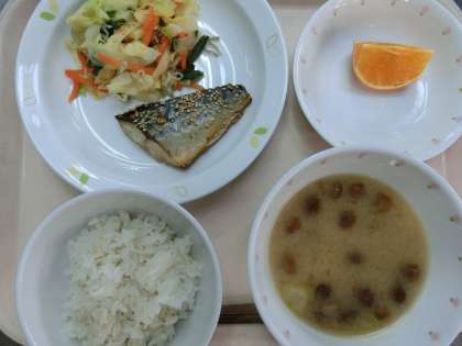 ごはん・魚の七味焼き・青菜とじゃこの生姜醤油・なめこ汁・くだもの