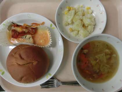 ココアパン・白身魚のピザ風・コーンポテト・白インゲン豆スープ