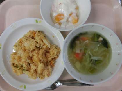 キムチチャーハン・ベーコンと野菜のスープ・フルーツヨーグルト