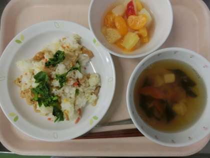 菜の花寿司・ジョア・澄まし汁・もものフルーツポンチ