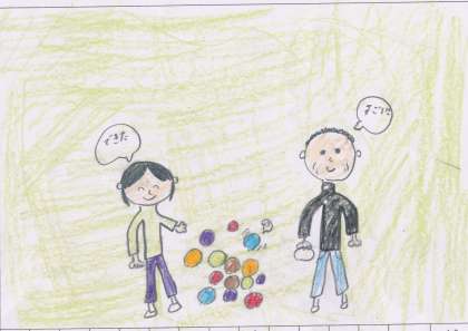 わたしは、お手玉のところでおばあちゃんと楽しく遊びました。けん玉とかあやとりもしました。あそび時間が終わって、給食も食べました。とってもおいしかったです。