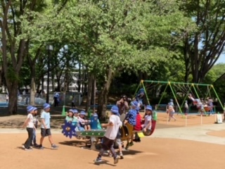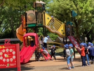 今日は2年生の遠足です。芦花公園駅から電車で東府中の「ふちゅうの森公園」まで来ました。公園の広場にはアスレチックがたくさんあり、思いっきり体を使って、元気よく遊びました。この後は、おいしいお弁当をいただきます。