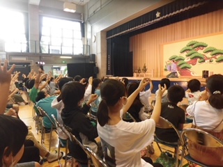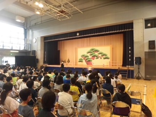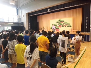 6年生は心の劇場の余韻が残る中、古典芸能の鑑賞として、烏山北小学校へ行きました。烏山北小の6年生と一緒に体育館で鑑賞しました。