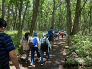たくさんの自然の中、ハイキングを楽しみました。気持ちの良い風です。とんぼがたくさん飛んでいます。日差しもそれほど強くありません。みんな元気いっぱい歩きました。