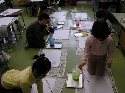 それでも、コツをつかみ始めると、「わぁ、こんなに大きなあわができたよ。」 「見て、見て、きれいなもようになったよ。」 いつの間にか教室にはプーンと石鹸のいい香りが広がっていました。