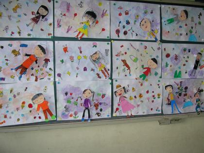 この画用紙を背景に、想像したことをサインペンやクレヨンでかき足し、世界で一つしかない作品作りを楽しみました。この作品は新1年生の教室の装飾に使用予定です。