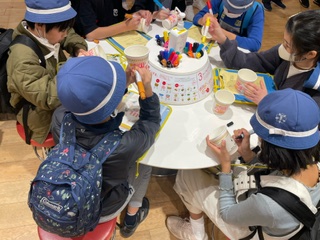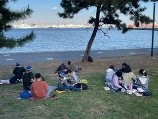 5年生の社会科見学、午前はカップヌードルミュージアムの見学です。食糧生産の仕組みや安藤百福の生き方について学び、味と具材を自分で選んだオリジナルヌードル作りを体験しました。その後、海が見える広場でお弁当を食べました。