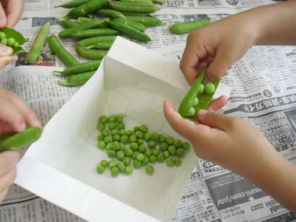 さやに入ったままのグリーンピースを見るのは初めてだったので、子どもたちは最初の説明から、とても興味深く聞いていました。