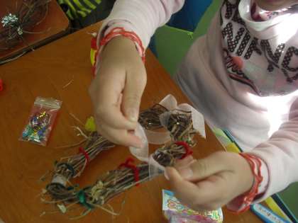 子どもたちは、ご家庭で用意していただいたリボンやビーズなどで楽しく飾りつけをしていました。