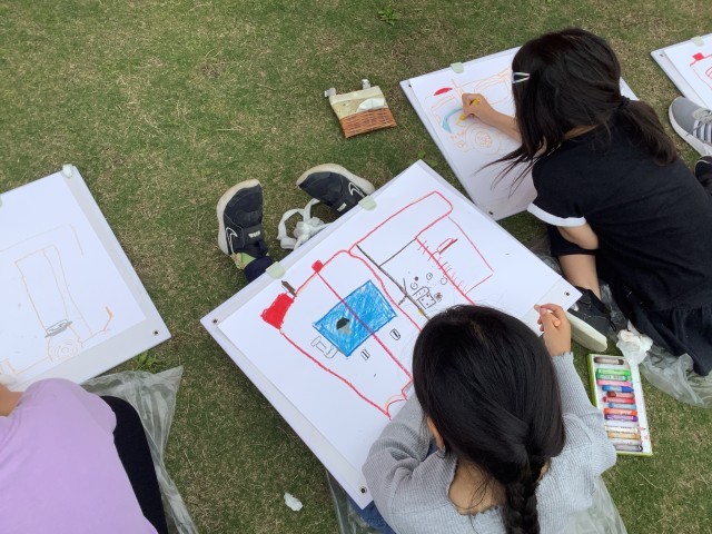 校庭に出て消防車を見た子どもたちは、「消防車、大きい!すごい!」「車が2台もあるよ!」「早く描きたい!」と釘付けでした。本物の消防車に夢中になりながら、消火ホースやはしごなど消防車の特徴を見つけながら、絵を描いていました。