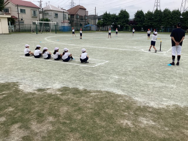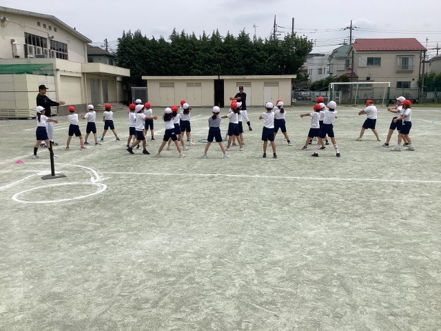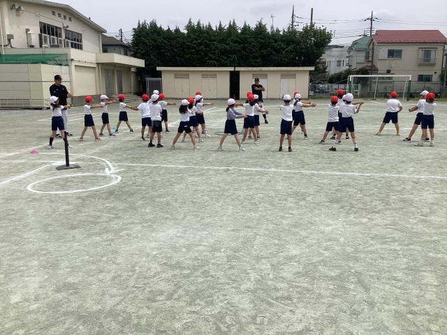 打ち方や、野球を基にした「バックホームゲーム」を教えていただき、実践しました。初めてバットを握ったという児童もいましたが、上手に打てると笑顔を見せていました。