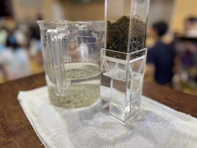 社会科「水はどこから」の学習で出前授業を依頼し、水道水がどのようにして家や学校に届くのか教えてもらいました。水源林やダムの働きについて映像や写真をもとに学んだり、浄水場ではどのようにして川の水をきれいにしているのかグループごとに実験をしたりして、理解を深めました。また、地震に強い水道管への取り替えを行っていることや災害時給水ステーションが都内には多くあることも分かり、災害時にどのように備えているのかを知ることができました。子どもたちは話を真剣に聞いており、「水は貴重なもので大切にしなければならない。」「飲めない国もあるから水を大切に使う。」などの感想が挙がりました。これからも、限られた水資源を大切にする気持ちをもち続けてほしいと思います。