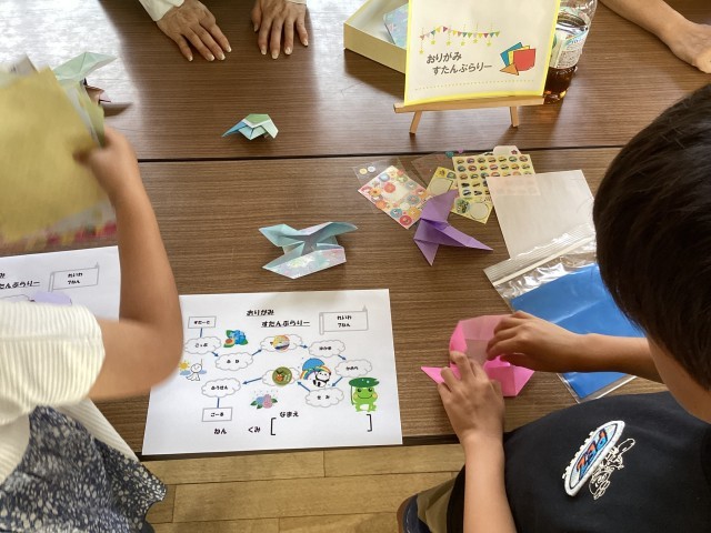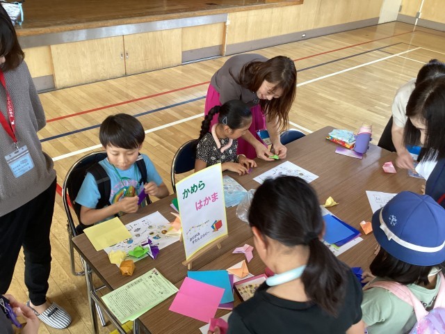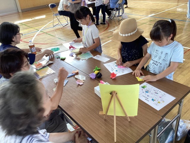 「おりがみ」では、体育館でコップややっこさん、カメラ、紙飛行機を折りました。