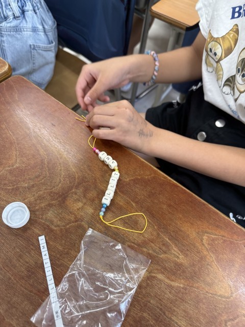 「ストラップ作り」は、木でできたアルファベットのキューブをつなぎ、オリジナルのストラップを作りました。