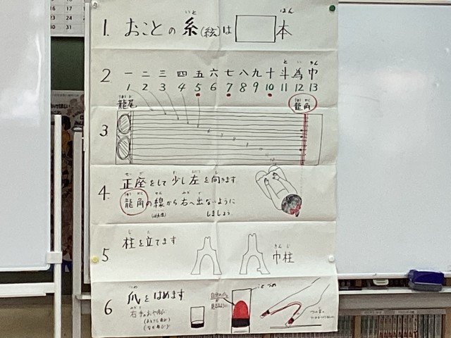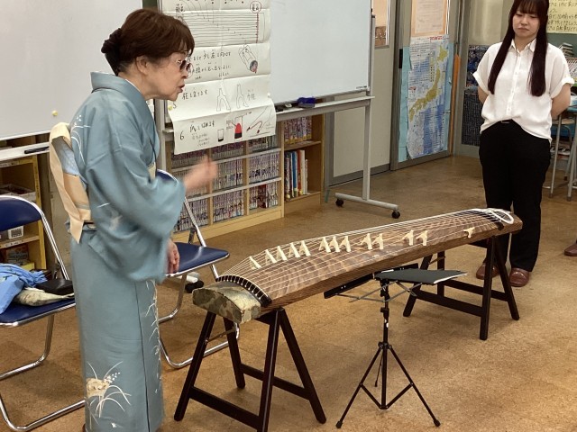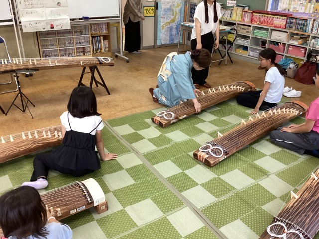 「箏曲・お琴」では、日本の伝統楽器であるお琴に親しみました。琴を横や裏からも見て、楽器のつくりも知りました。