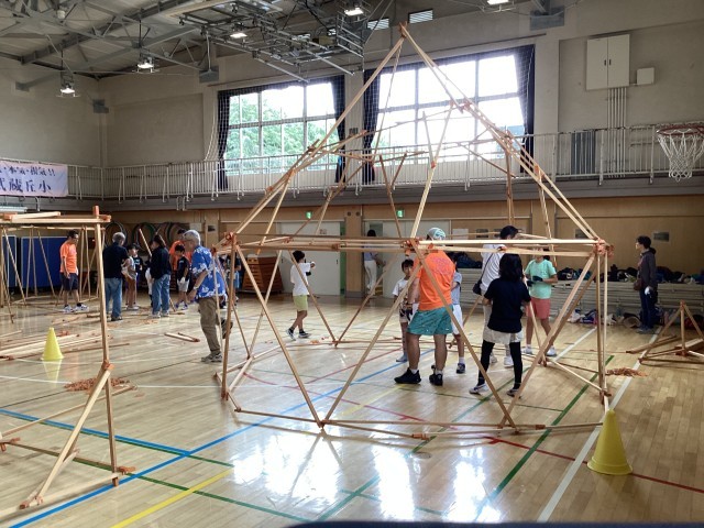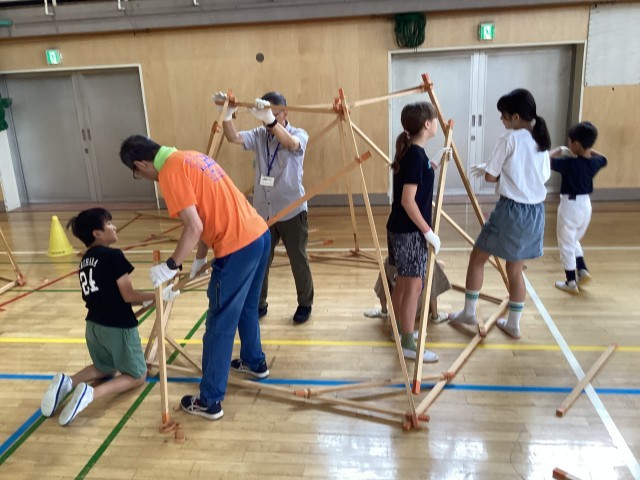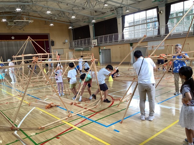 「空間ワークショップ」では、体育館で木材とゴムを使い、実物大の家(基地)を作りました。日本建築家協会世田谷地域会とむさしおやじの会の皆様がお手伝いしてくださいました。