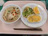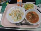 今日の給食は、三色ピラフ・ミネストローネ・ポテト入りフレンチサラダ・オレンジジュ...